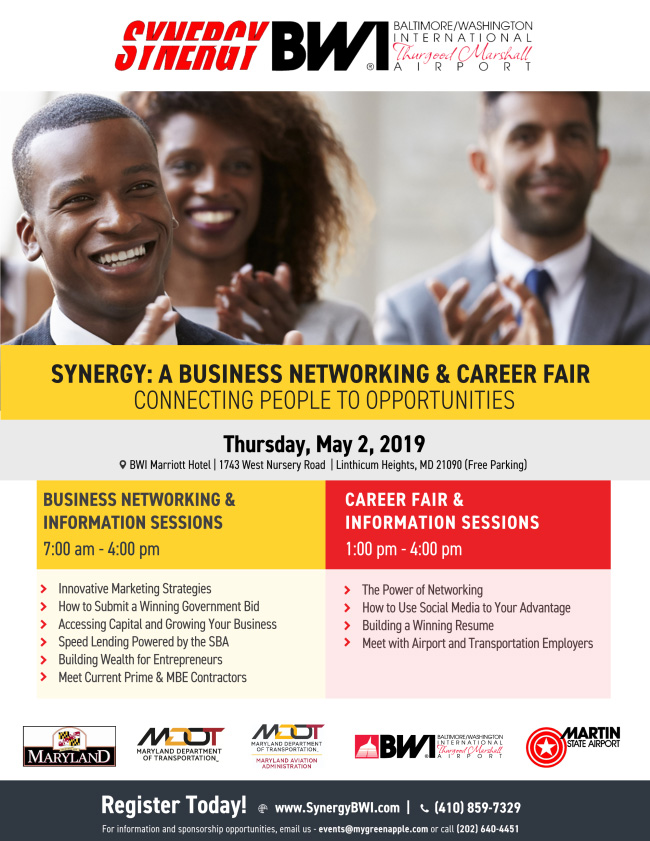 Sign up now for Synergy 2019 to learn about business opportunities with the Maryland Aviation Administration and employment opportunities at BWI Marshall Airport.
