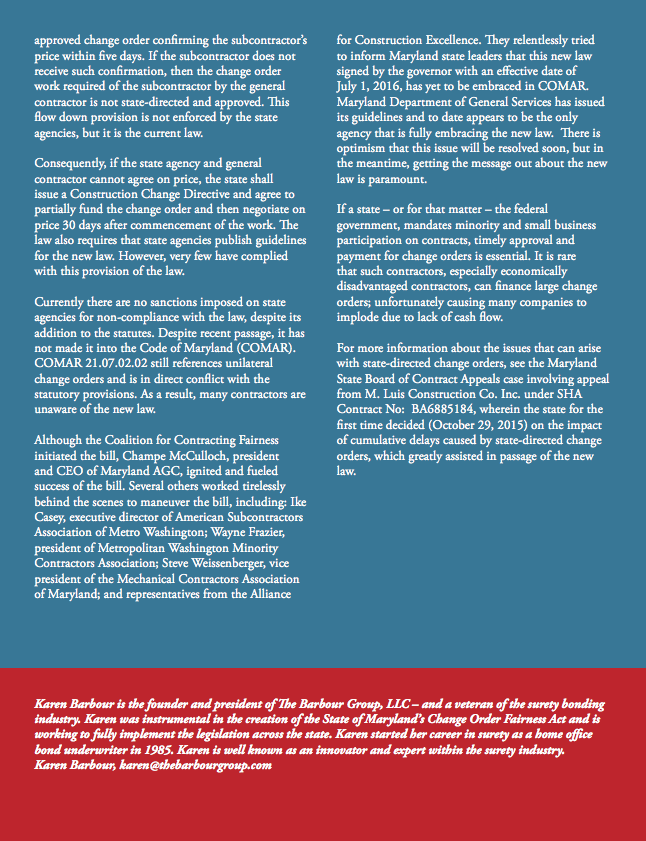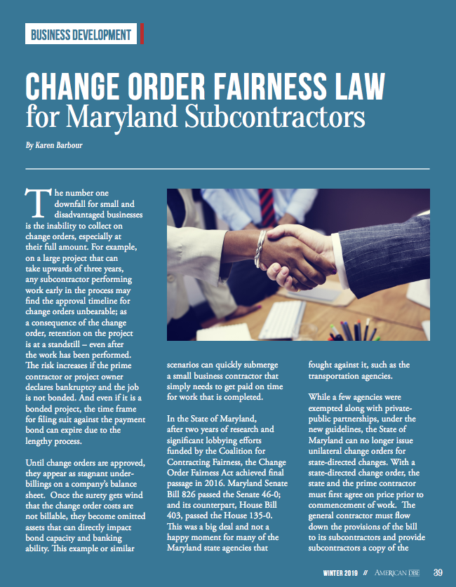 Read Karen Barbour's article on change order fairness law from "American DBE Winter 2019" magazine.
